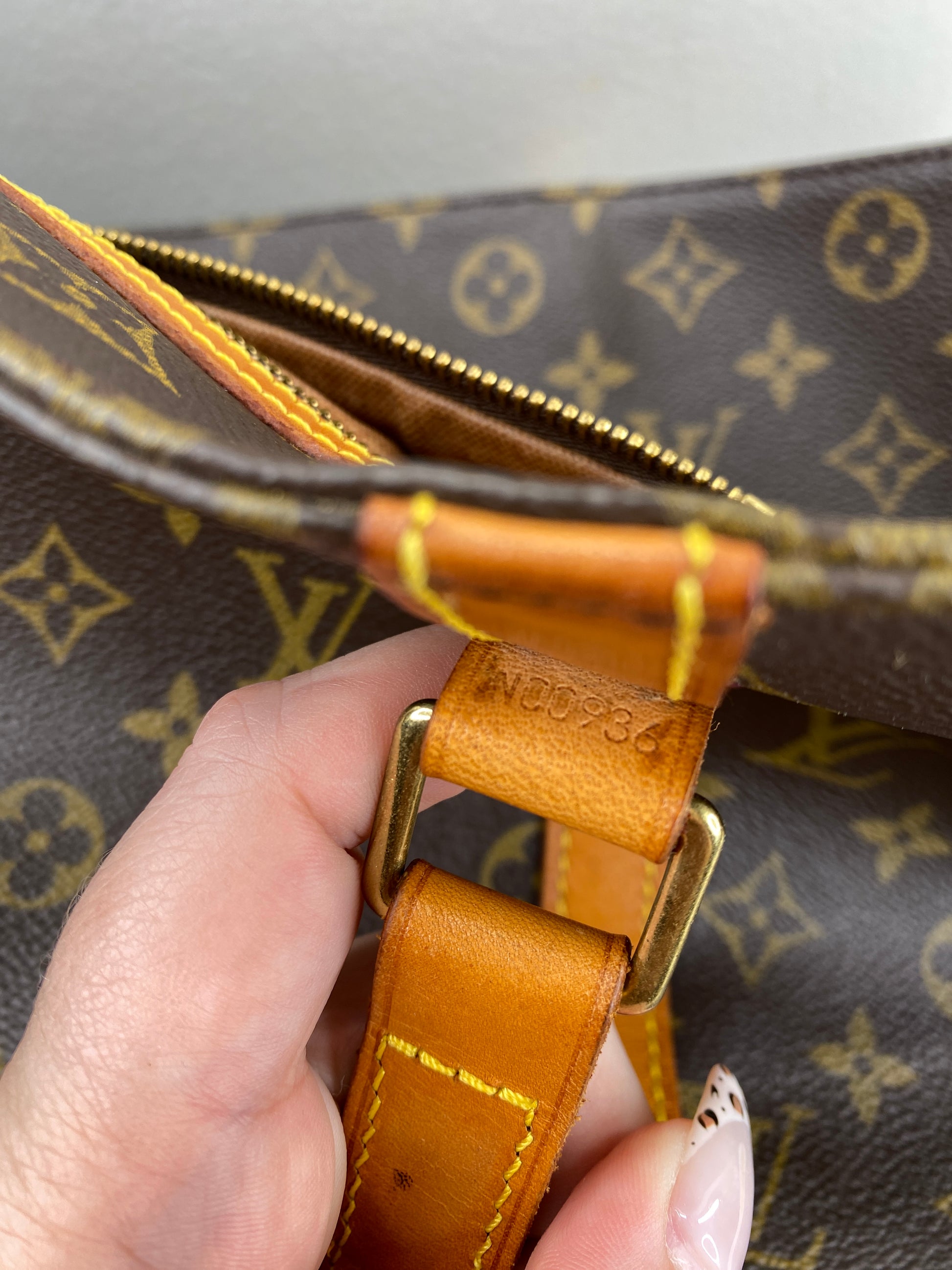 👜HARDWARE: Overall FAIR condition w/ some wear and typical aging. All Chapes and studs are intact. Zipper in pocket works well. Some loss of gold tone or tarnish from age.